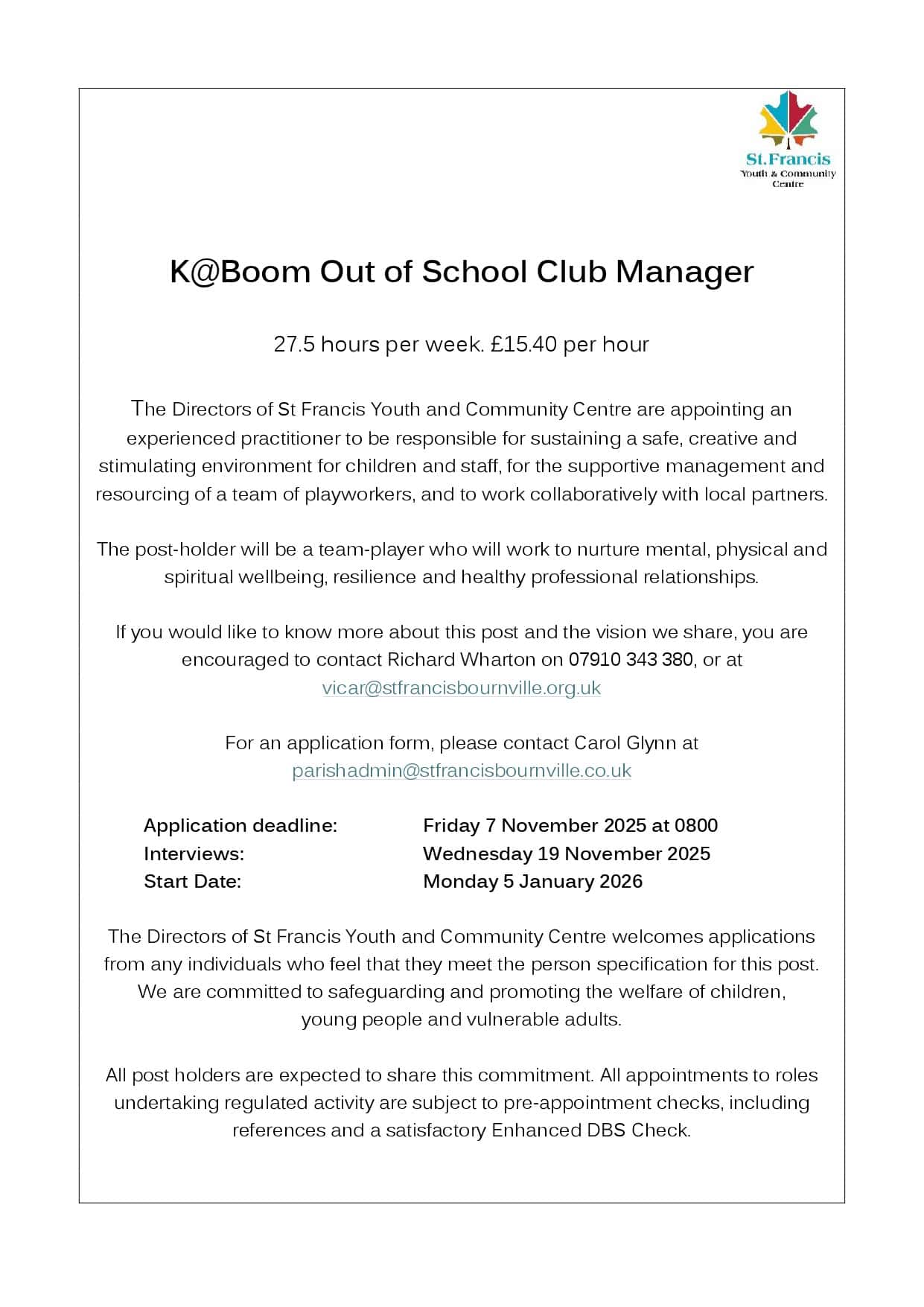 We're currently looking for a new manager for the K@boom out of school club at St Francis Youth and Community Centre. Click on the image below for more information.